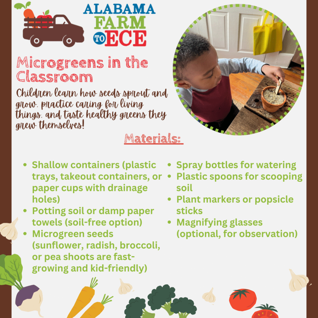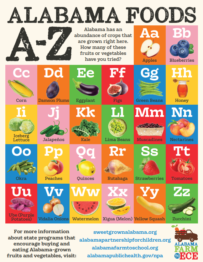 Acknowledgment: The Alabama Farm to ECE Coalition attributes the resources listed to the following organizations: National Farm to School Network, the Association of State Public Health Nutritionists, Alabama Department of Agriculture & Industries, the United States Department of Agriculture, and the Alabama Cooperative Extension System.